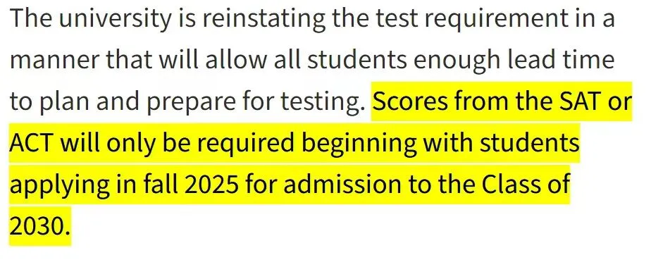 从2025年秋季起,申请该校本科的学生将需要提交SAT(学术能力评估测试)或ACT(美国大学入学考试)成绩。